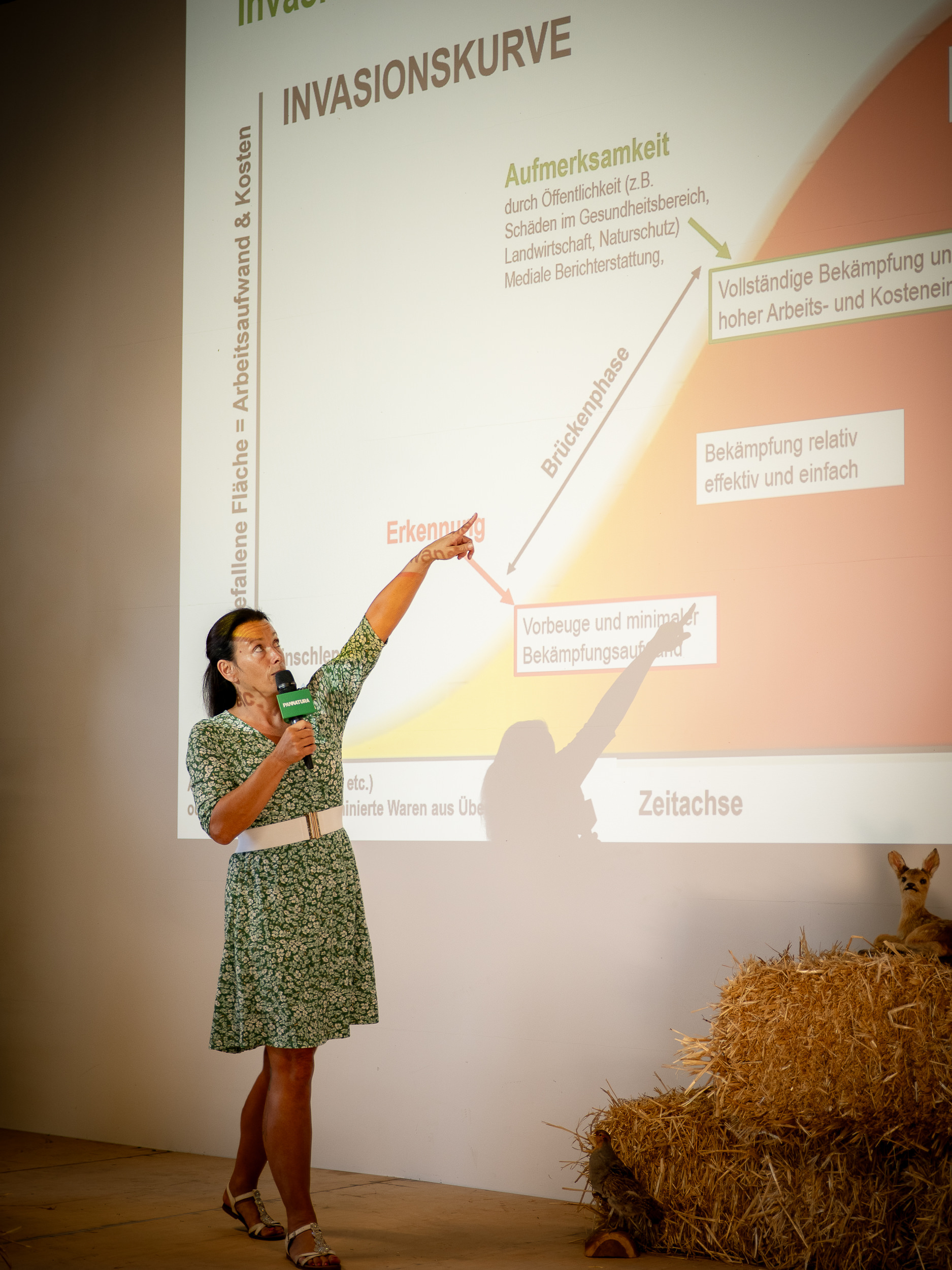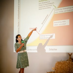 Dr. Rea Maria Hall von der Universität für Bodenkultur Wien zeigte in ihrem Vortrag, wie invasive Pflanzenarten landwirtschaftliche Ökosysteme beeinflussen und welche Bekämpfungsstrategien derzeit erforscht werden. Sie betont: „Wandel ist die einzige Konstante – das gilt auch für invasive Pflanzen. Sie wurden von uns Menschen hierher gebracht und die fehlende Koevolution mit unseren heimischen Pflanzen und Tieren stellt unsere Gesellschaft heute vor große Herausforderungen.“