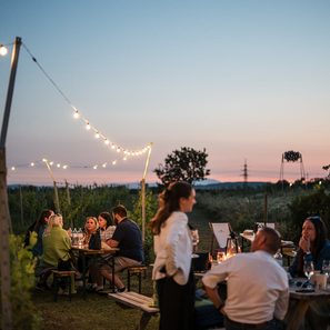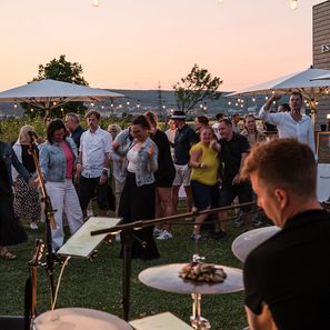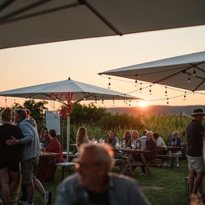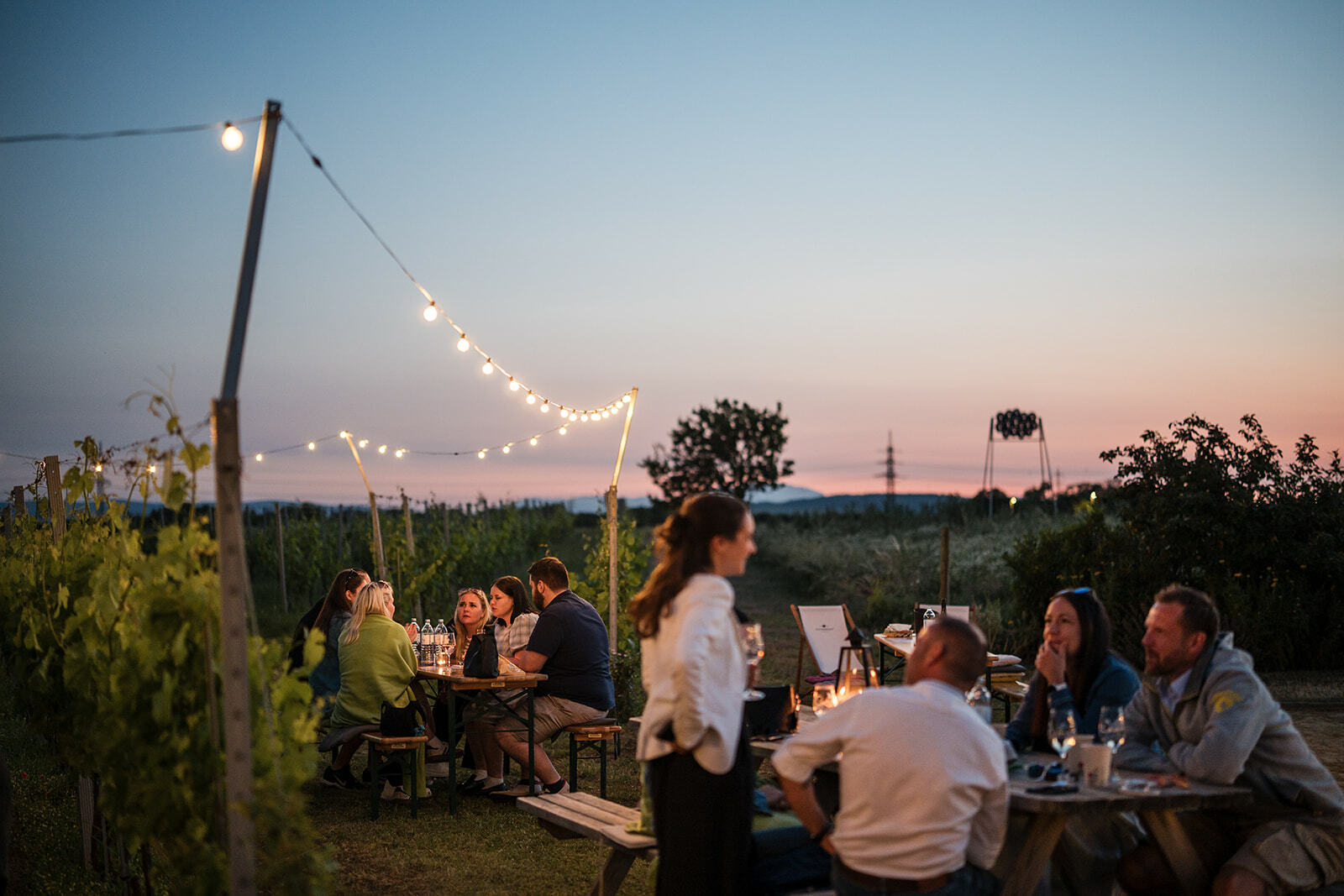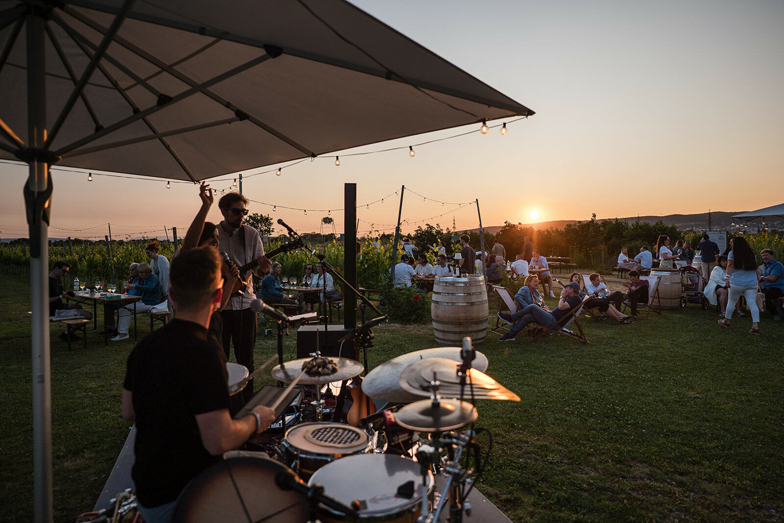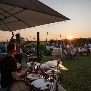 Aber nicht nur die Geschmackssinne werden verwöhnt. Für die passende musikalische Untermalung sorgt die akustische Coverband Mai Tunes. Mit ihrer gemütlichen Chillout Live-Musik begleiten sie die Gäste im Schaumweingarten in den wunderschönen Sonnenuntergang. Wer einen Blick hinter die Kulissen der Weinproduktion wagen möchte, kann um 18.00 Uhr bei einer spannenden Kellerführung mehr über die Geologie der Leithaberg-Weingärten und die Besonderheiten des Weinbaus erfahren.
